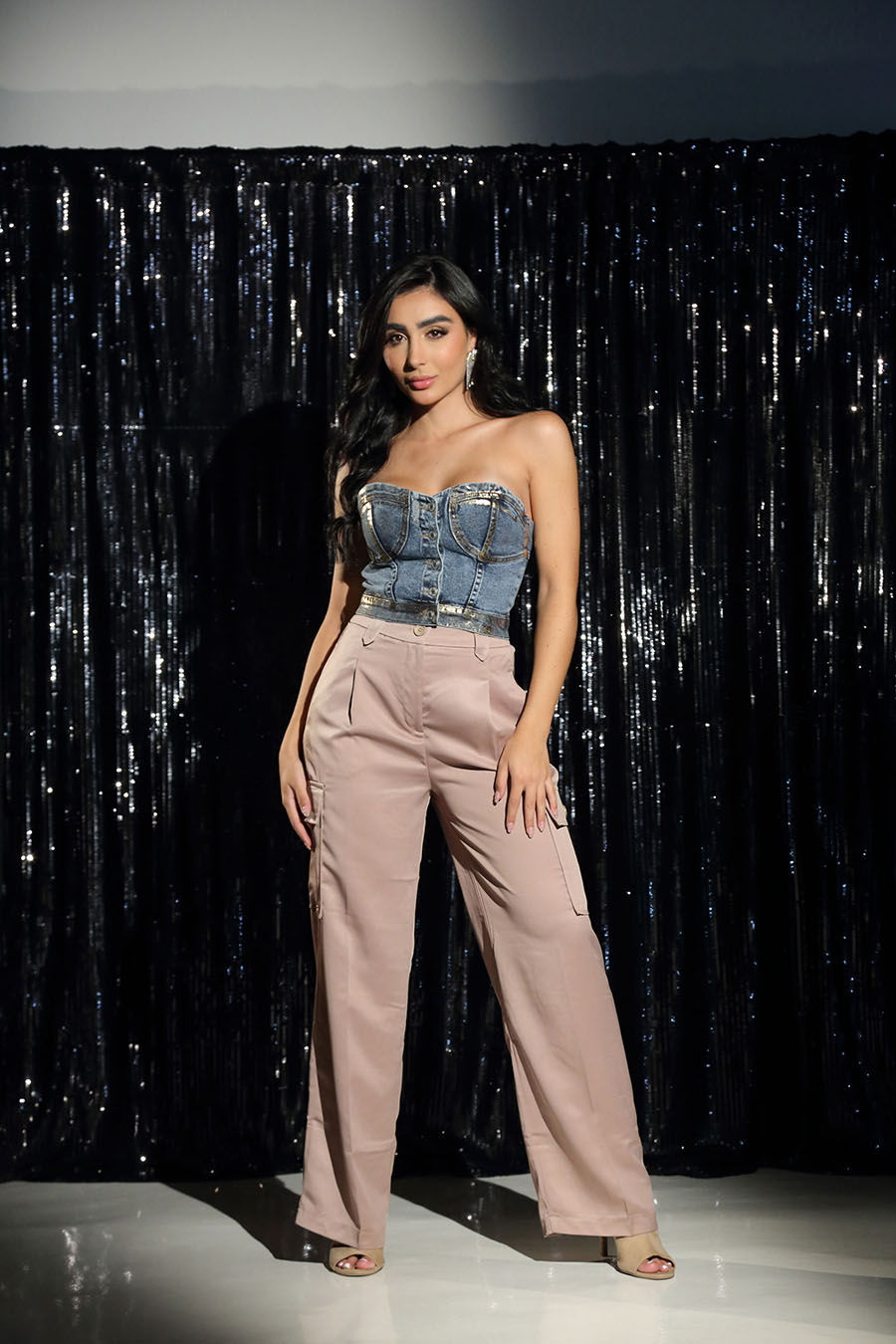 CROP TOP JEAN PINTAS METALIZADAS BOTONES RESORTE ESPALDA